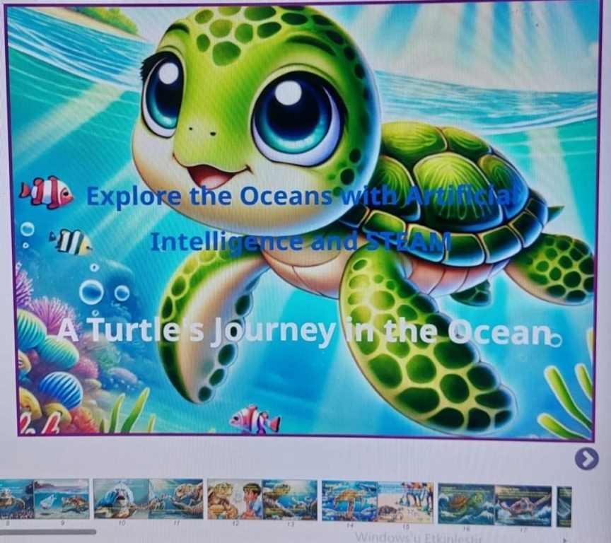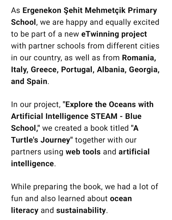 Ergenekon Şehit Mehmetçik İlkokulu olarak, ülkemizin farklı şehirlerinden ve Romanya, İtalya, Yunanistan, Portekiz, Arnavutluk, Gürcistan ve İspanya'daki ortak okullarla yeni bir Etwinning projesinde olmaktan mutluyuz bir o kadar da heyecanlıyız. Explore the Oceans with Artificial Intelligence STEAM-Blue school projemizde web araçları ve yapay zeka kullanarak ortaklarımızla hazırladığımız kitabımız A TURTLE’S JOURNEY IN THE OCEAN öğrencilerimiz ve ortaklarımız kitabı hazırlarken hem eğlendiler hemde okyanus sürdürülebilirlik okuryazarlığı hakkında bilgilendiler.